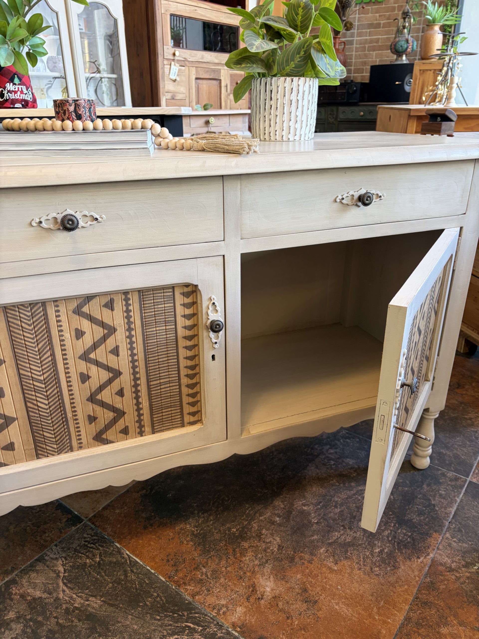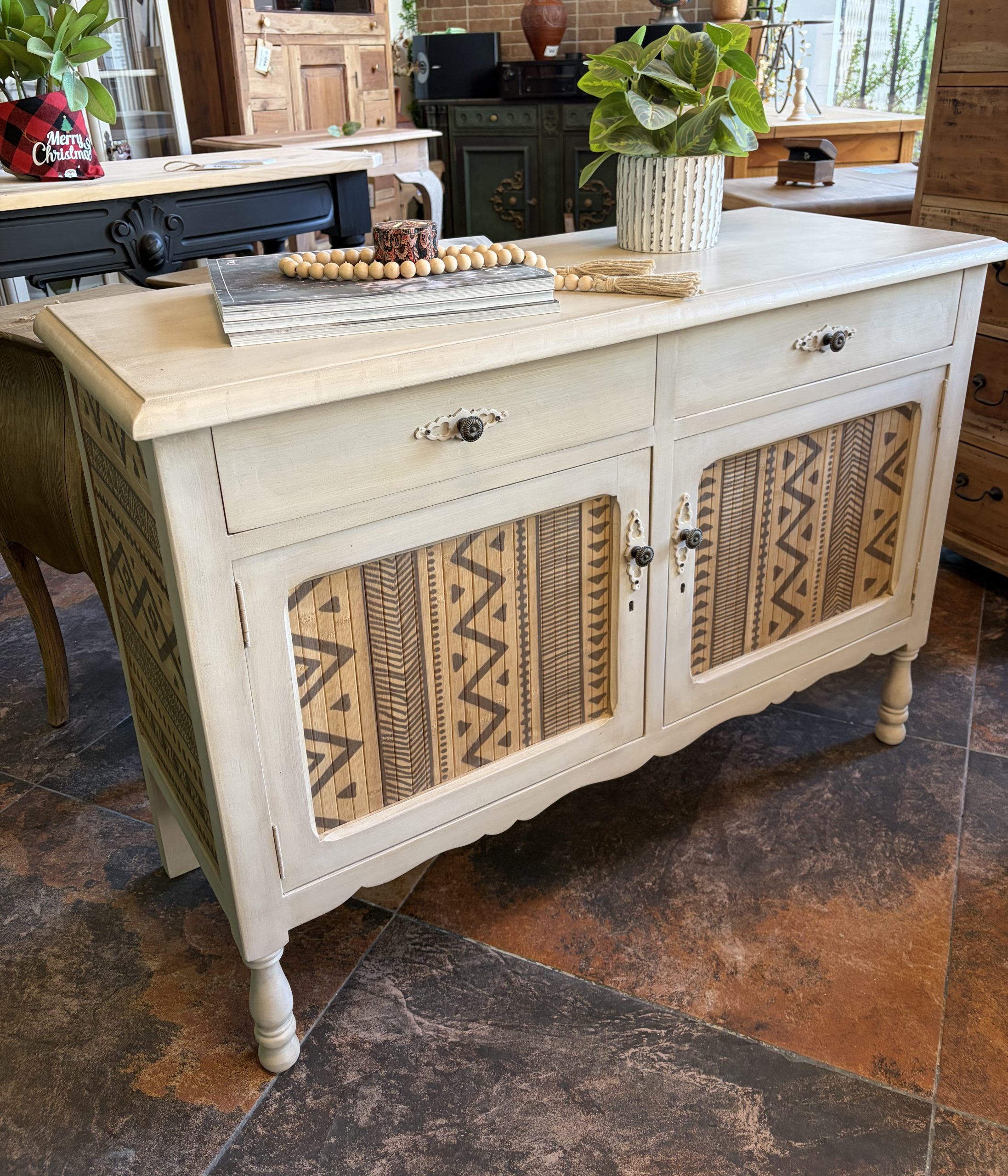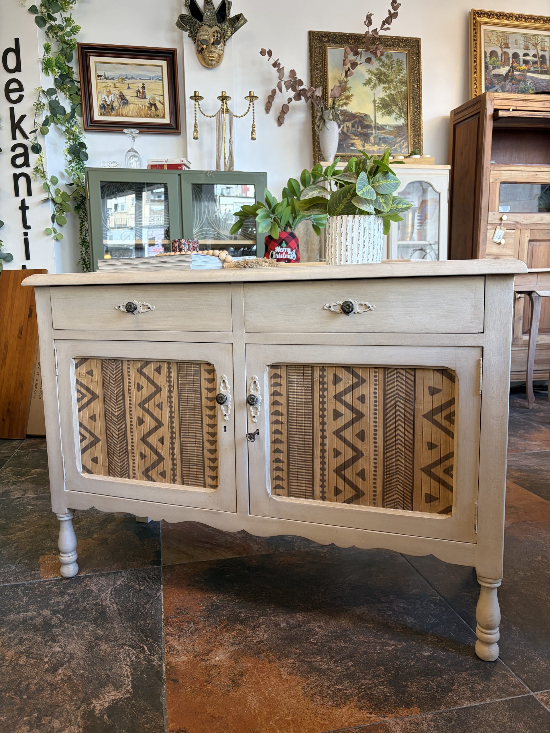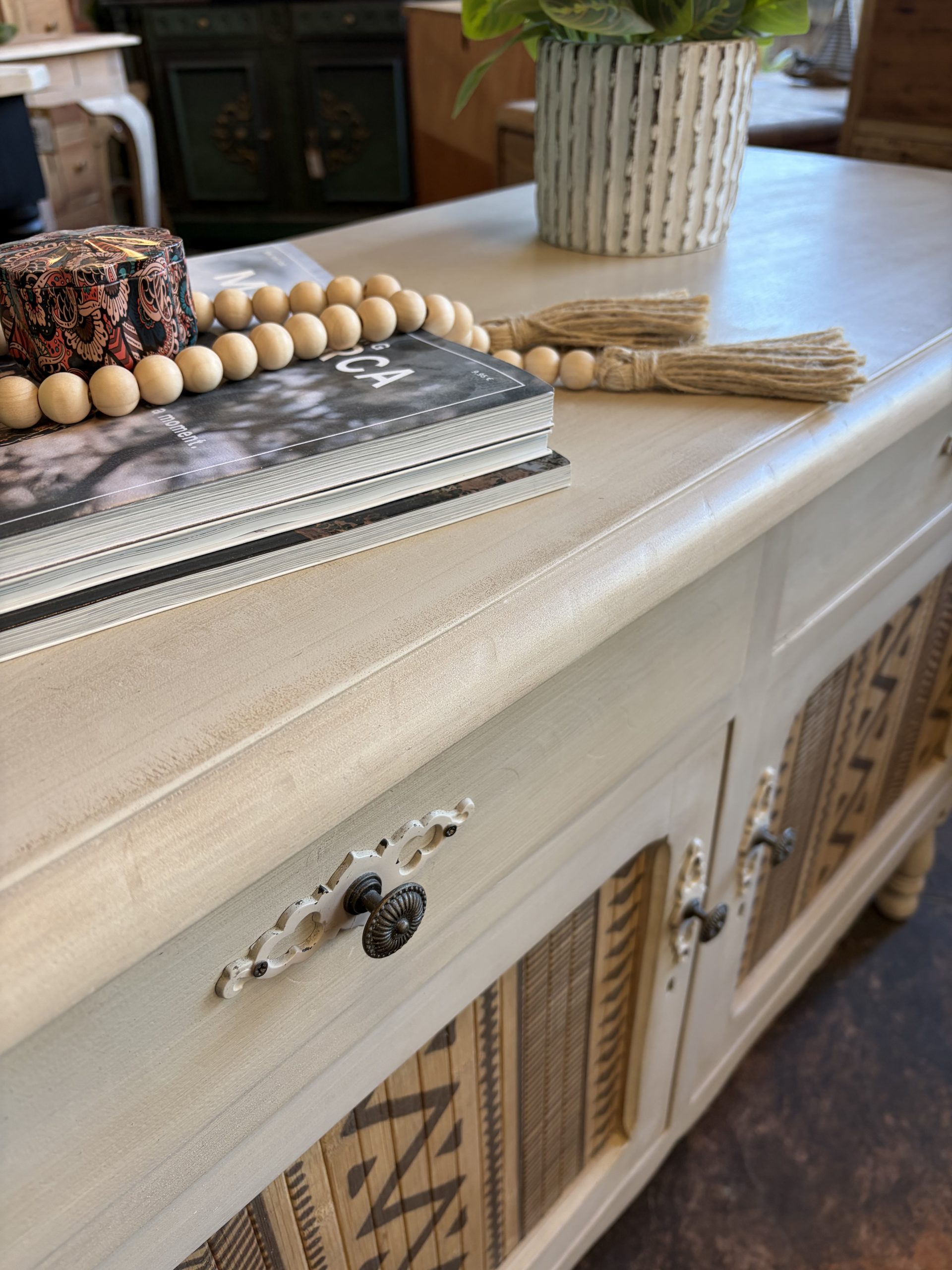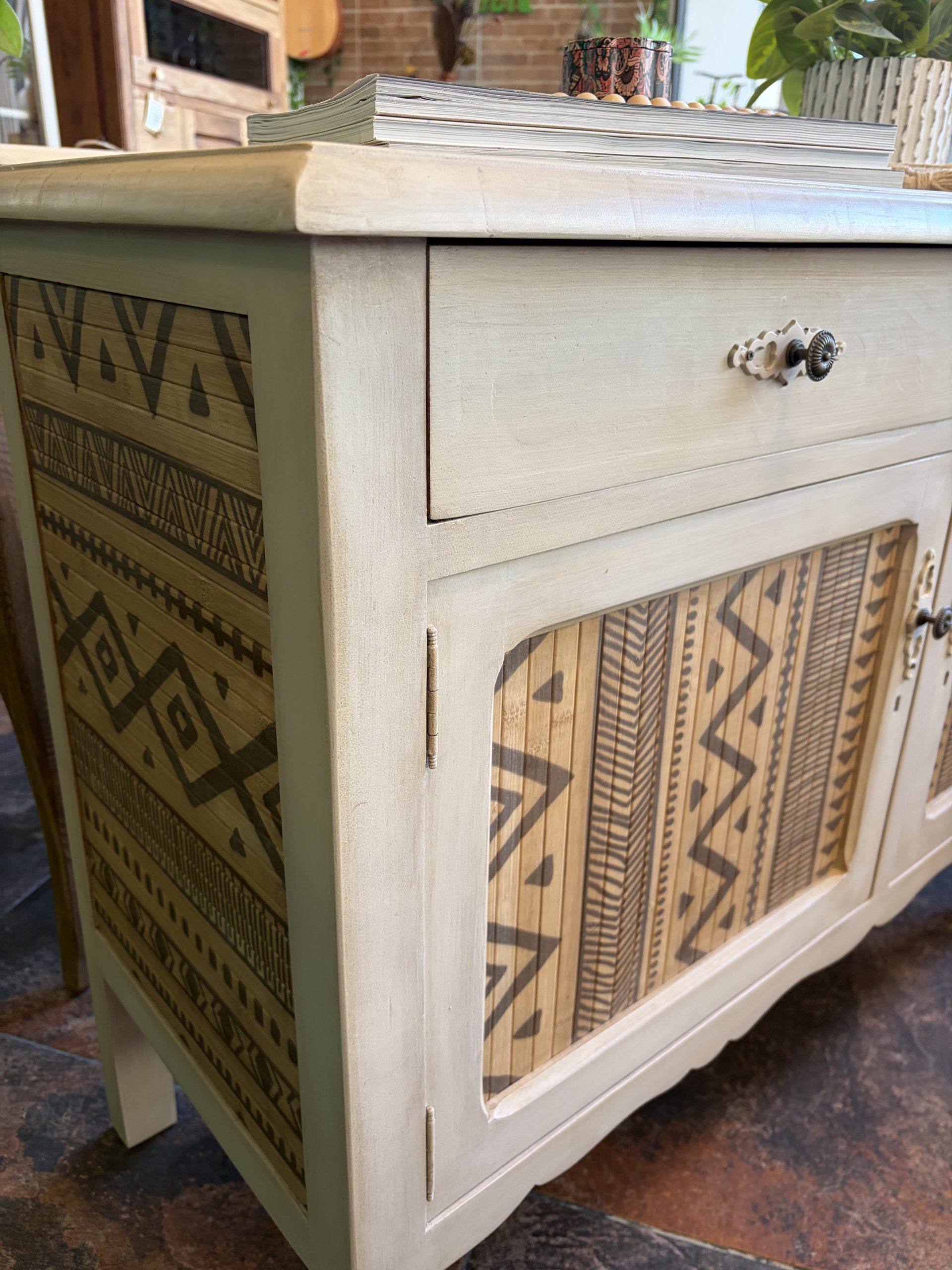 Aparador vintage de madera renovado en cálido tono beige y bambú, con acabado moderno y detalles originales que aportan un estilo fresco y atemporal.