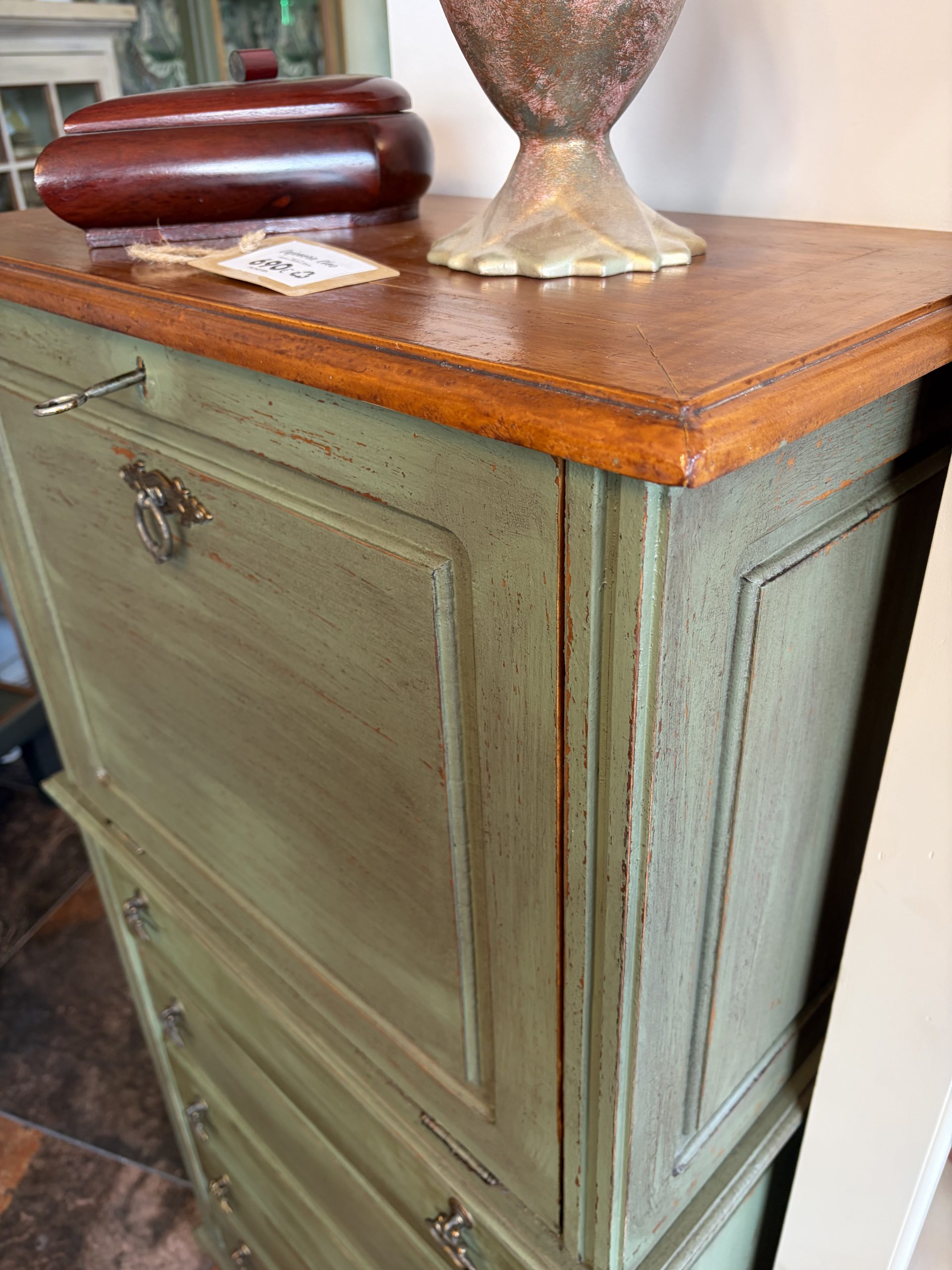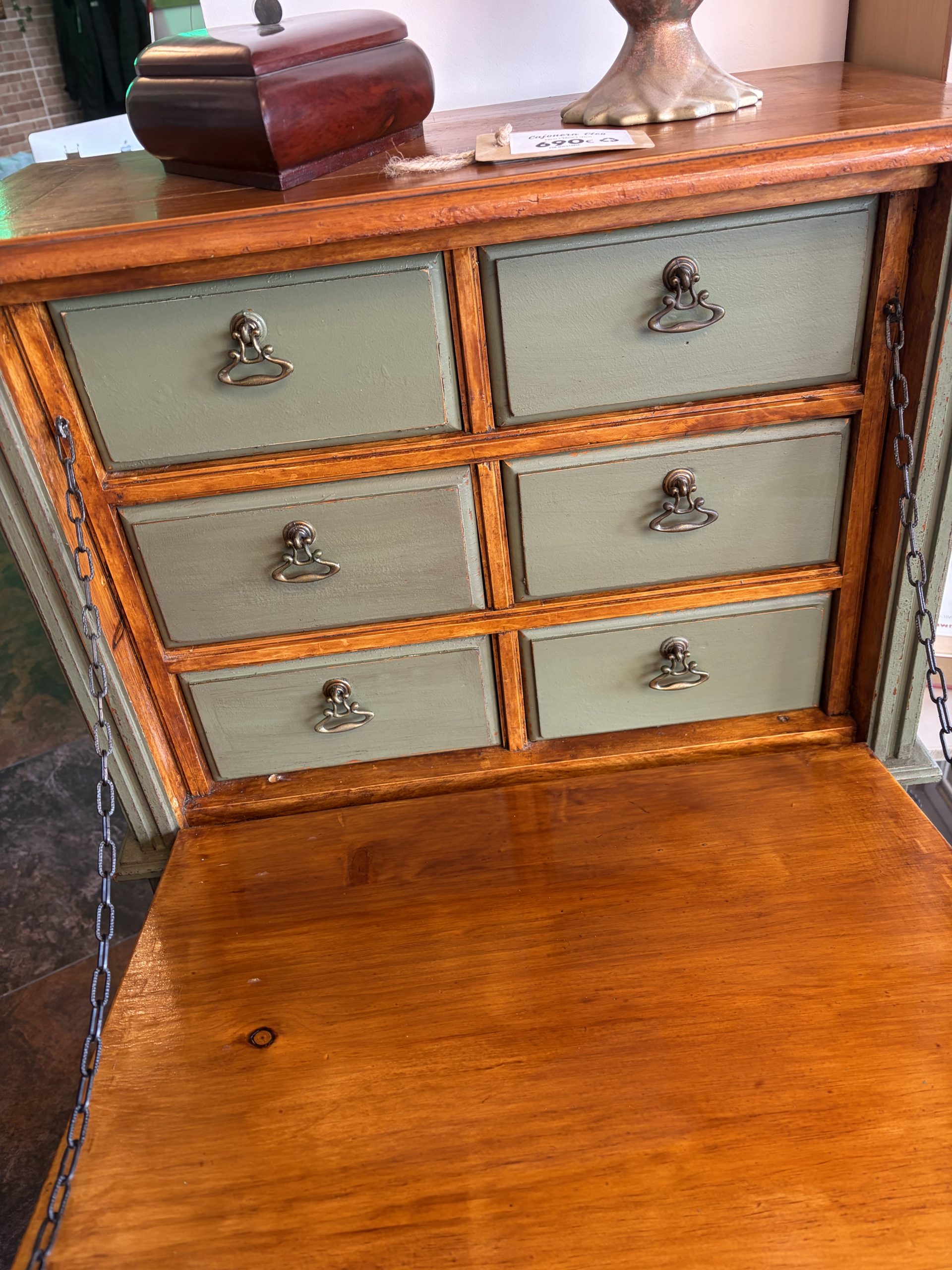 Cajonera vintage en color verde, con múltiples cajones y tapa abatible. Ideal para escritorio o almacenaje, combina estilo clásico y funcionalidad. Pieza única y artesanal.