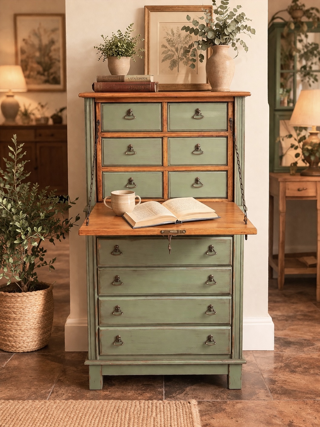 Diseño Multifuncional: Destaca por su ingeniosa tapa abatible que permite transformarla en un escritorio auxiliar, combinando el estilo clásico con la versatilidad que requiere el hogar moderno.