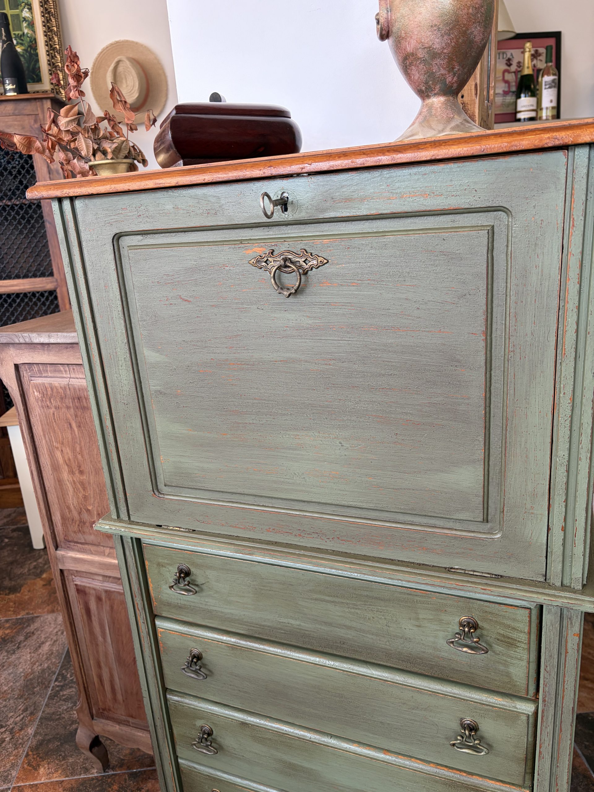 Materiales: Madera maciza recuperada con acabados artesanales en verde seda.