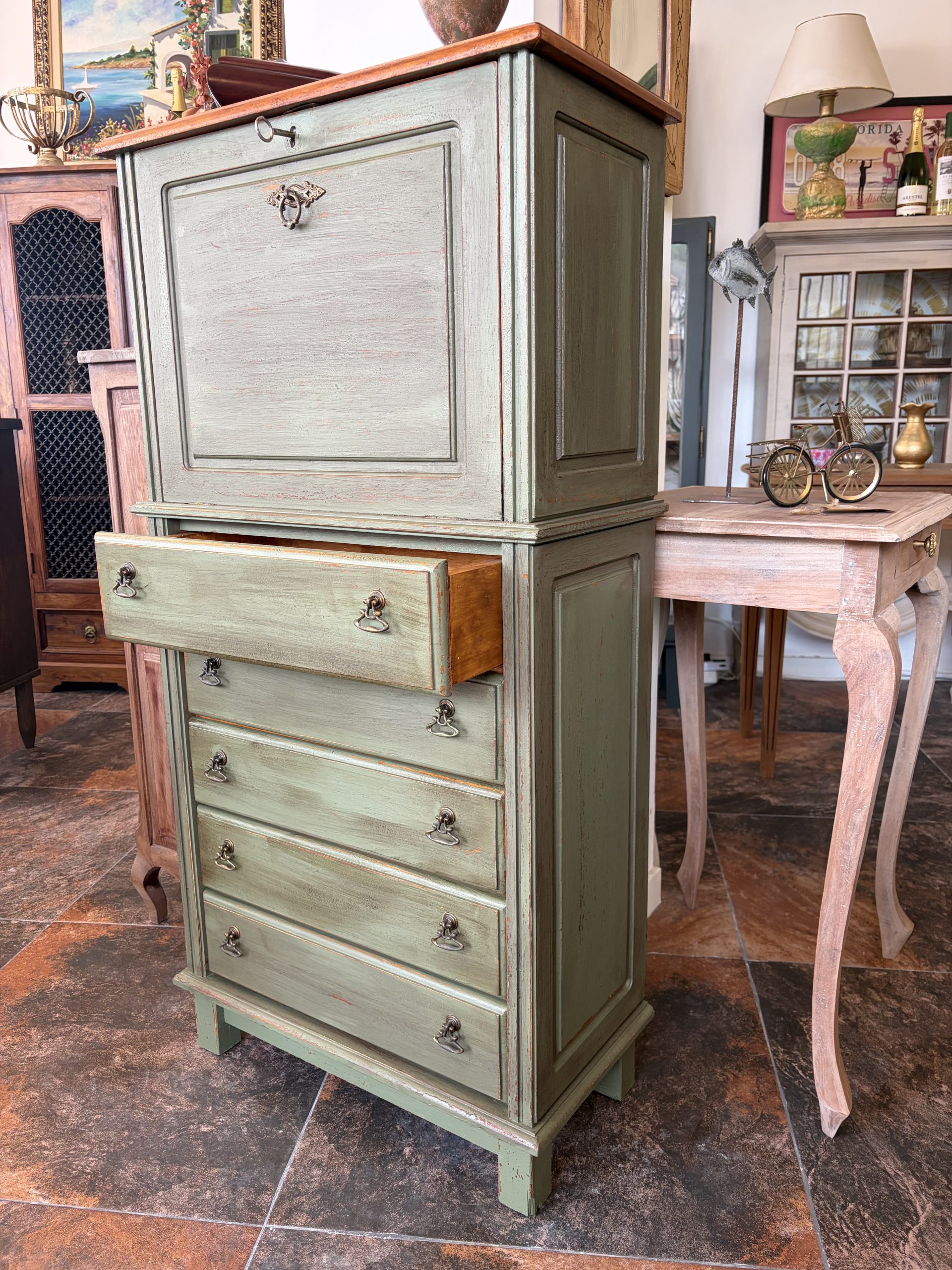 Si buscas una pieza que combine la nostalgia del diseño antiguo con una funcionalidad excepcional, nuestra Cajonera Cleo es la elección perfecta. Con su distintivo tono verde y su estructura de múltiples cajones, esta cajonera vintage no solo es una solución de organización impecable, sino una pieza con alma que aporta personalidad y un toque de distinción a cualquier oficina, dormitorio o salón.