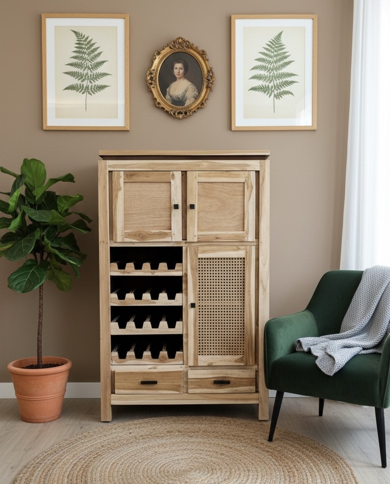 Pieza única y de gran valor que ofrece una combinación perfecta de elegancia y funcionalidad. Con una estructura robusta y un diseño que resalta la belleza natural de la madera de teca y el ratán este botellero es ideal para quienes buscan un mueble con carácter y estilo.