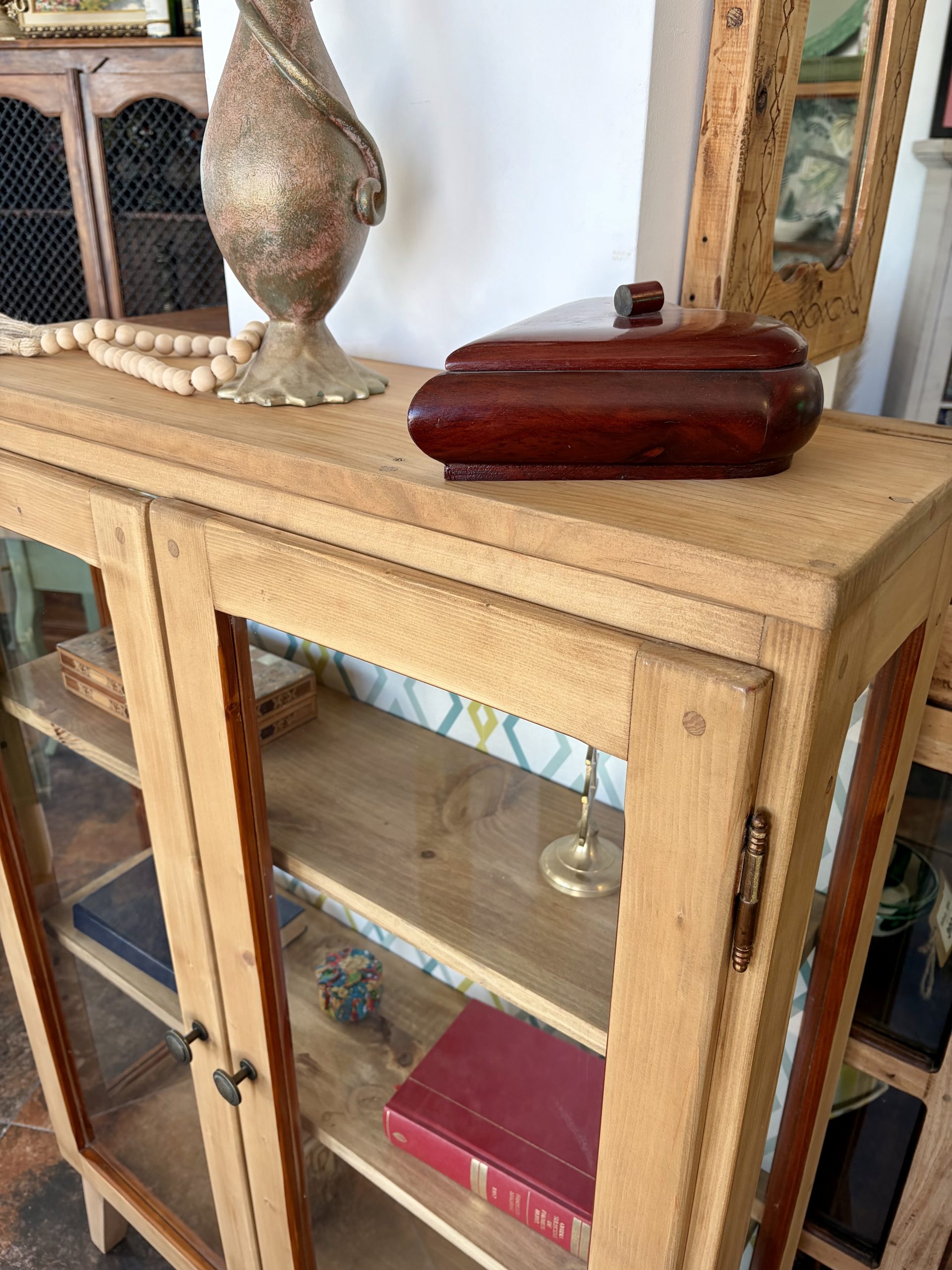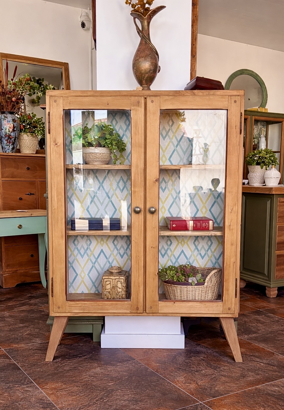 La Vitrina Kira es pequeña y ideal para quienes buscan elevar la estética de su hogar con un diseño vintage en madera natural. Rescatada para brillar, esta vitrina es un mueble con alma, diseñado no solo para almacenar, sino para convertir tus objetos más preciados en una verdadera exposición de estilo.