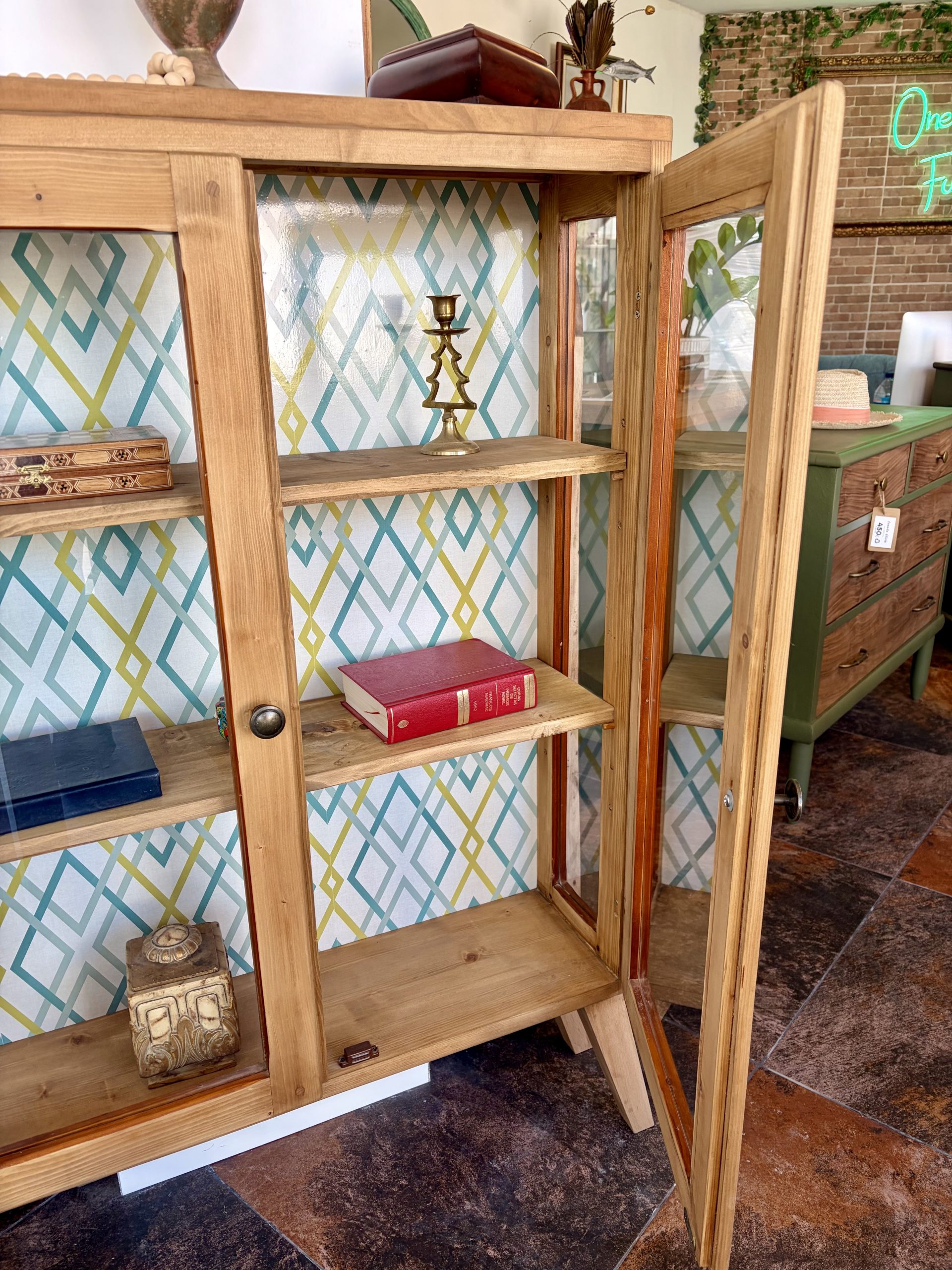 Detalle Interior Exclusivo: Su fondo decorado crea un contraste visual único que realza cualquier objeto expuesto.