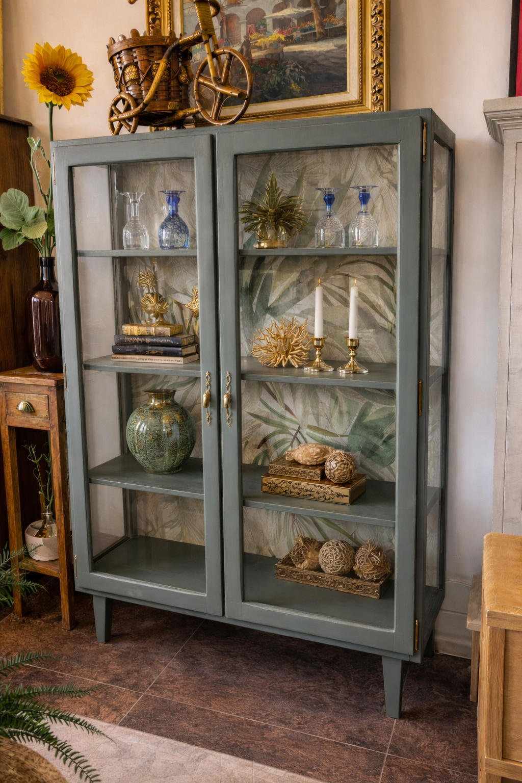 La Vitrina Lina es ideal para quienes buscan elevar la estética de su hogar con un diseño moderno y lleno de color. Rescatada para brillar, esta vitrina combina un tono azul en su exterior con un sorprendente fondo de motivos botanicos que aporta modernidad y frescura. Un mueble con alma, diseñado no solo para almacenar, sino para convertir tus objetos más preciados en una verdadera exposición de estilo.